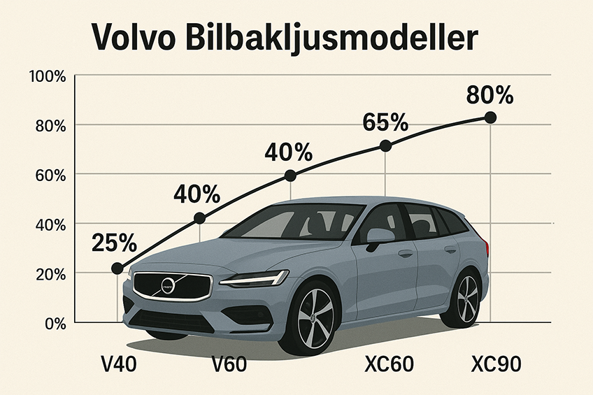 Bildtext: Volvo Bilbakljusmodeller: Denna infografik visar en kurva med populära Volvo-modeller och deras bakljusstyper. En bild av en Volvo-bil i förgrunden illustrerar utvecklingen, med procentuella data längs kurvan som visar popularitet.